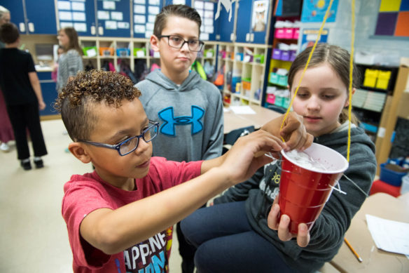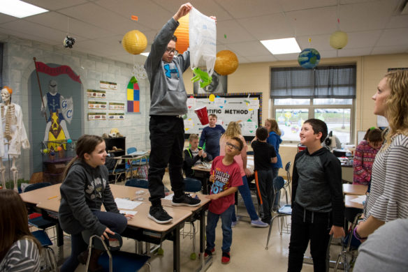 Max Bautista, a 4th grader at Graves Central Elementary (Graves County), stands on a desk to test the effectiveness of a parachute made by his group for a lab in Andria Thompson’s science class.