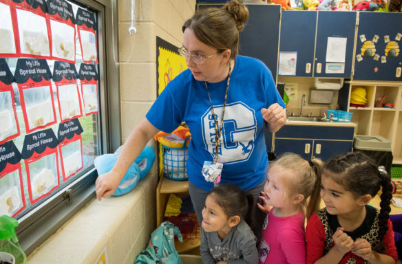 Daphne Boles, a preschool teacher at Graves Central Elementary, looks at a seed growing experiment with, from left, Dahlia Ruelas, Alana Hearson and Sophie Williams in Boles’ preschoool class.