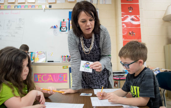Andrea Kemp, center, helps Charli Arnett, left, and Landon Walker with their math problems during her kindergarten class.