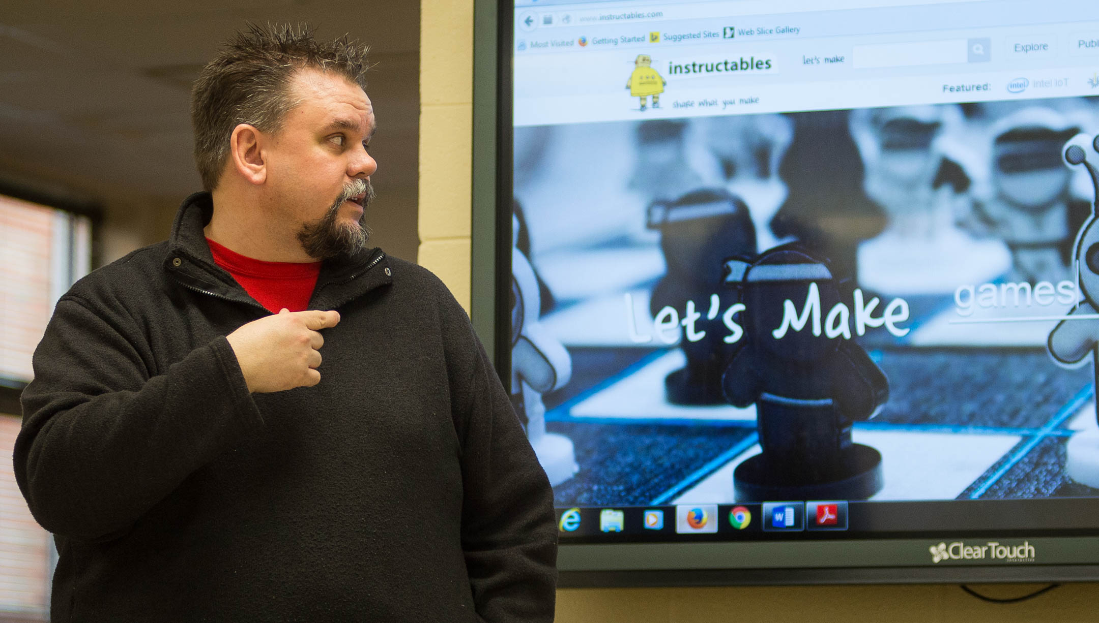 John Chaney shows the website Instructables to his 7th-grade Innovation Lab students. Students can use the website to find project ideas and how-to guides.