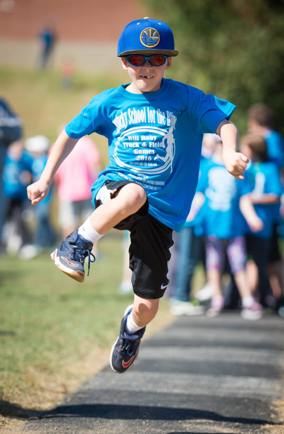 Landon Smith, a 4th-grader at the Kentucky School for the Blind, competes in the long jump competition at the 2016 Bill Roby Track and Field Games.