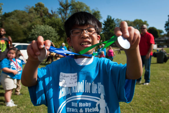 Hudson Lovett, a 2nd-grader at Kentucky School for the Blind, holds up the medals he won in the 2016 Bill Roby Track and Field Games.