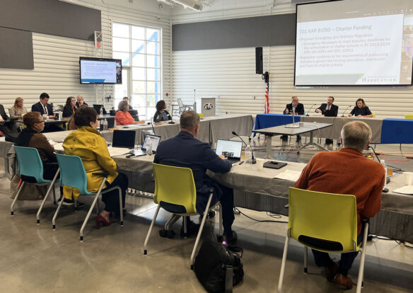 KDE Associate Commissioner Robin Kinney, KDE Office of Finance and Operations (OFO) Policy Advisor Matt Ross and OFO Director Chay Ritter also presented the board with a regulation and its accompanying emergency regulation regarding the funding of charter schools in Kentucky.
