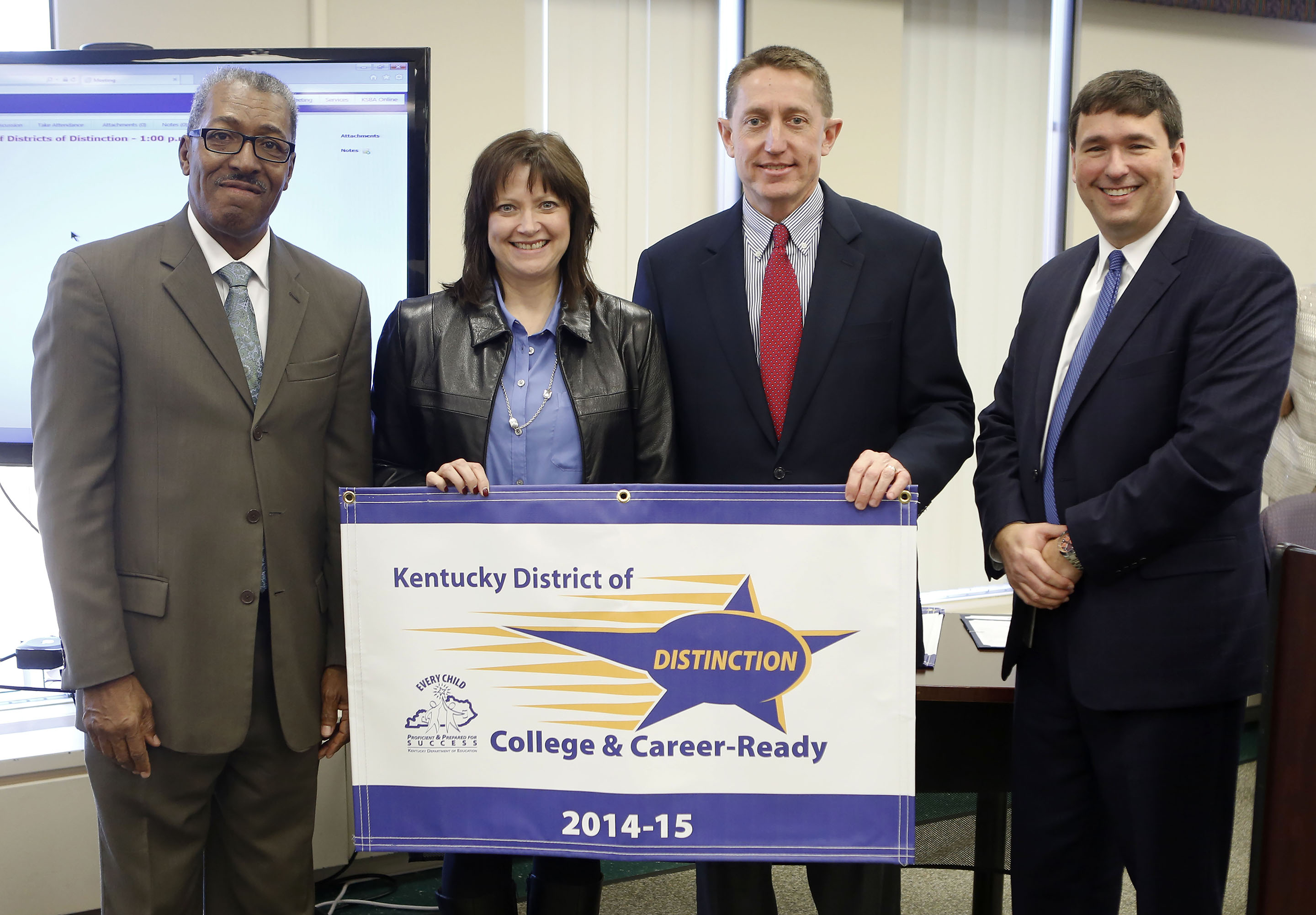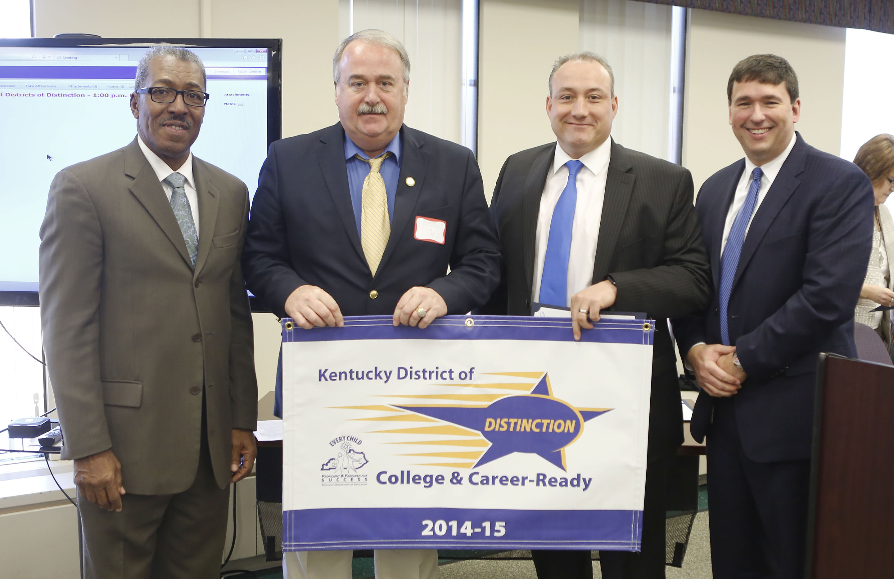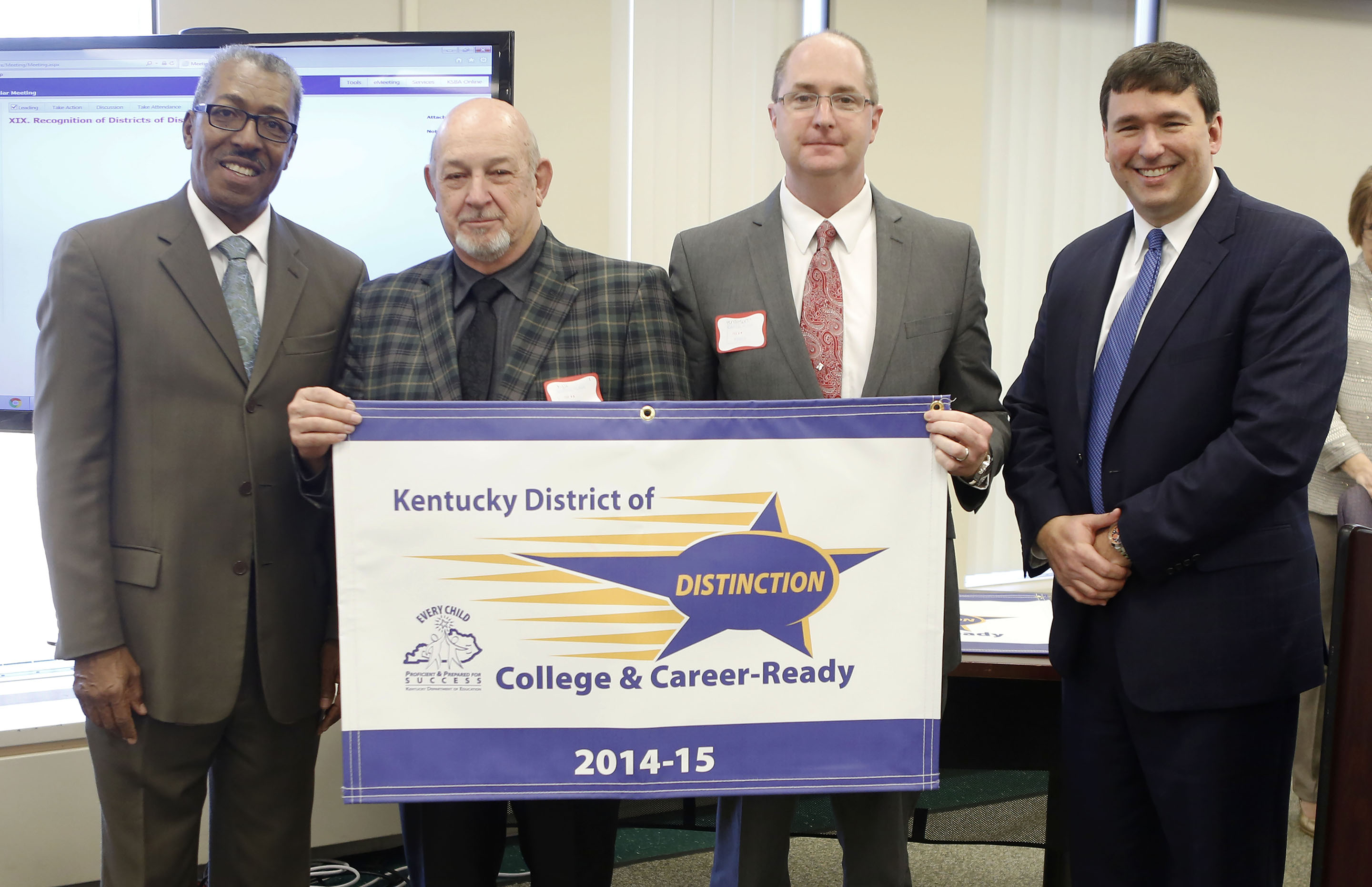 KBE Vice-Chair Bill Twyman and Commissioner of Education Stephen Pruitt presented each district superintendent and local board of education representative with a recognition banner and letter of commendation. Each district also will receive a District of Distinction logo which can be displayed on its website, letterhead or used in other ways to promote its accomplishment. Additionally, the three High Progress districts received a certificate of commendation.